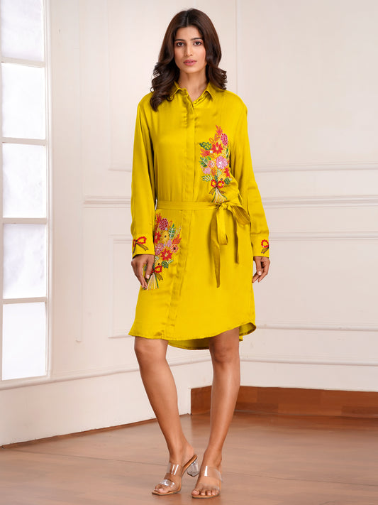 Mustard Floral Bouquet Silk Embroidered Shirt Dress