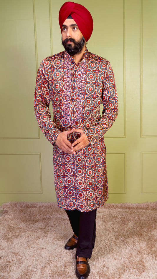 Cream & Red Ajrakh Embroidered Silk Kurta Set