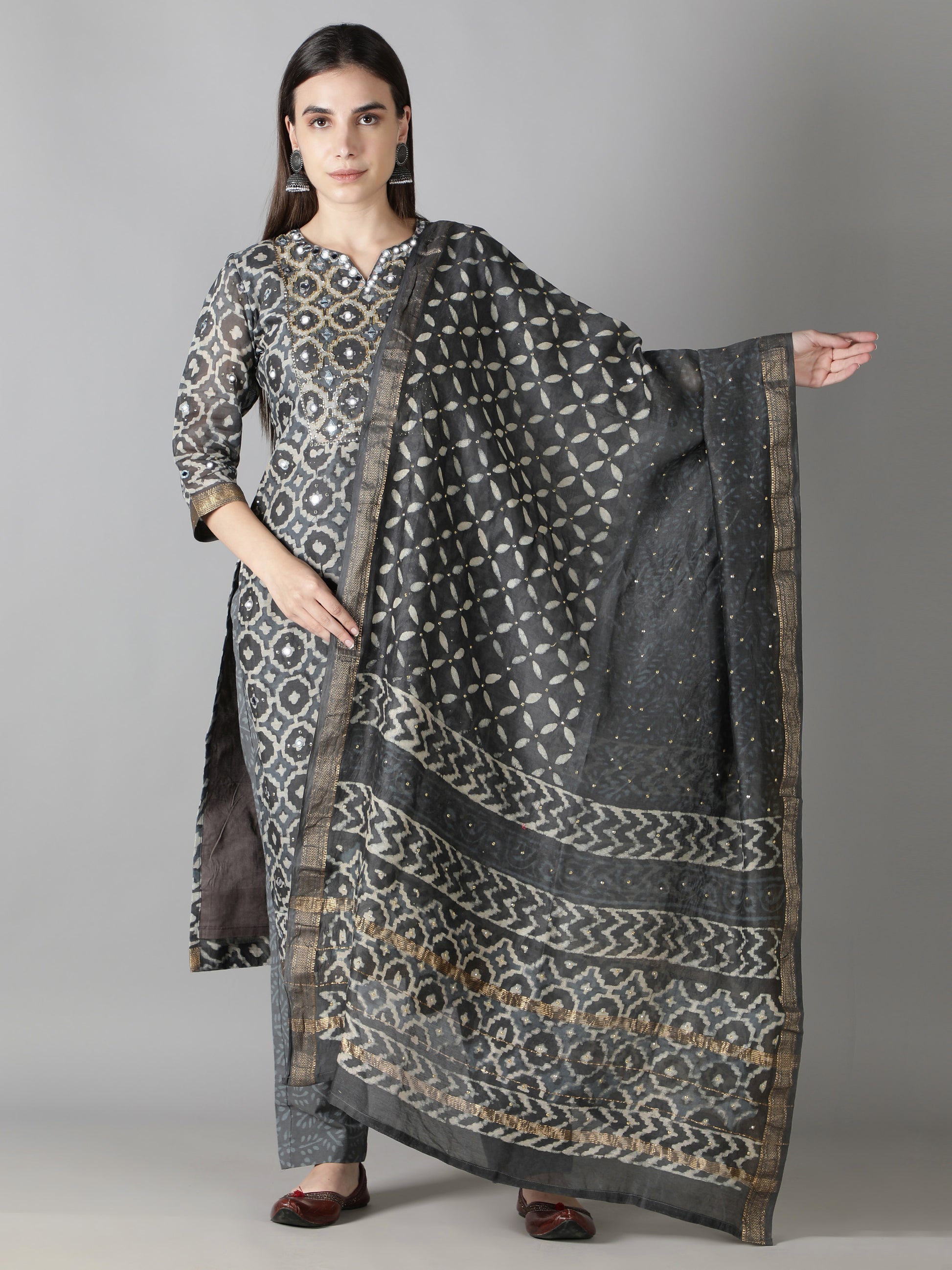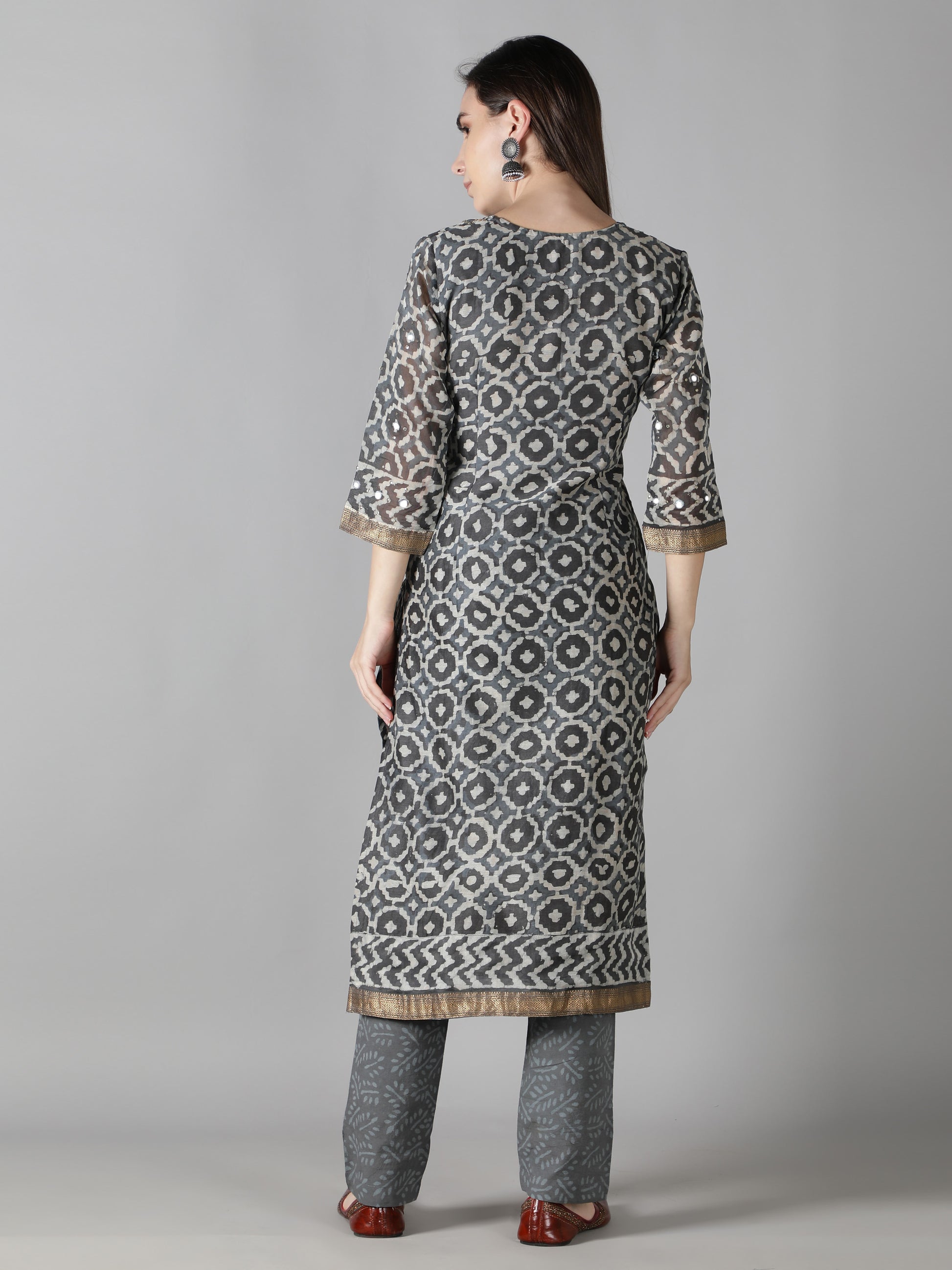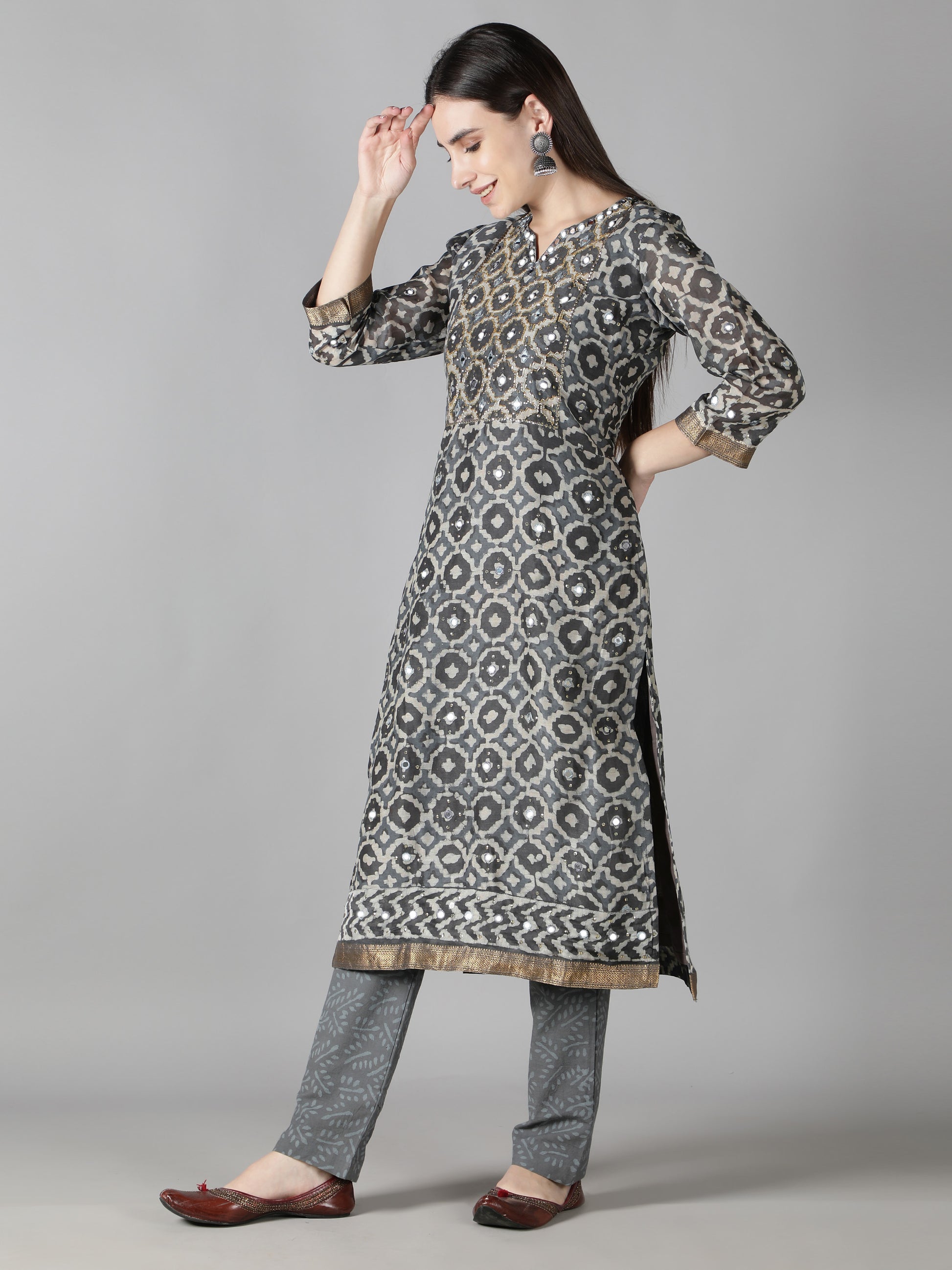 1. The grey silk of the kurta vividly contrast with the dull white motifs