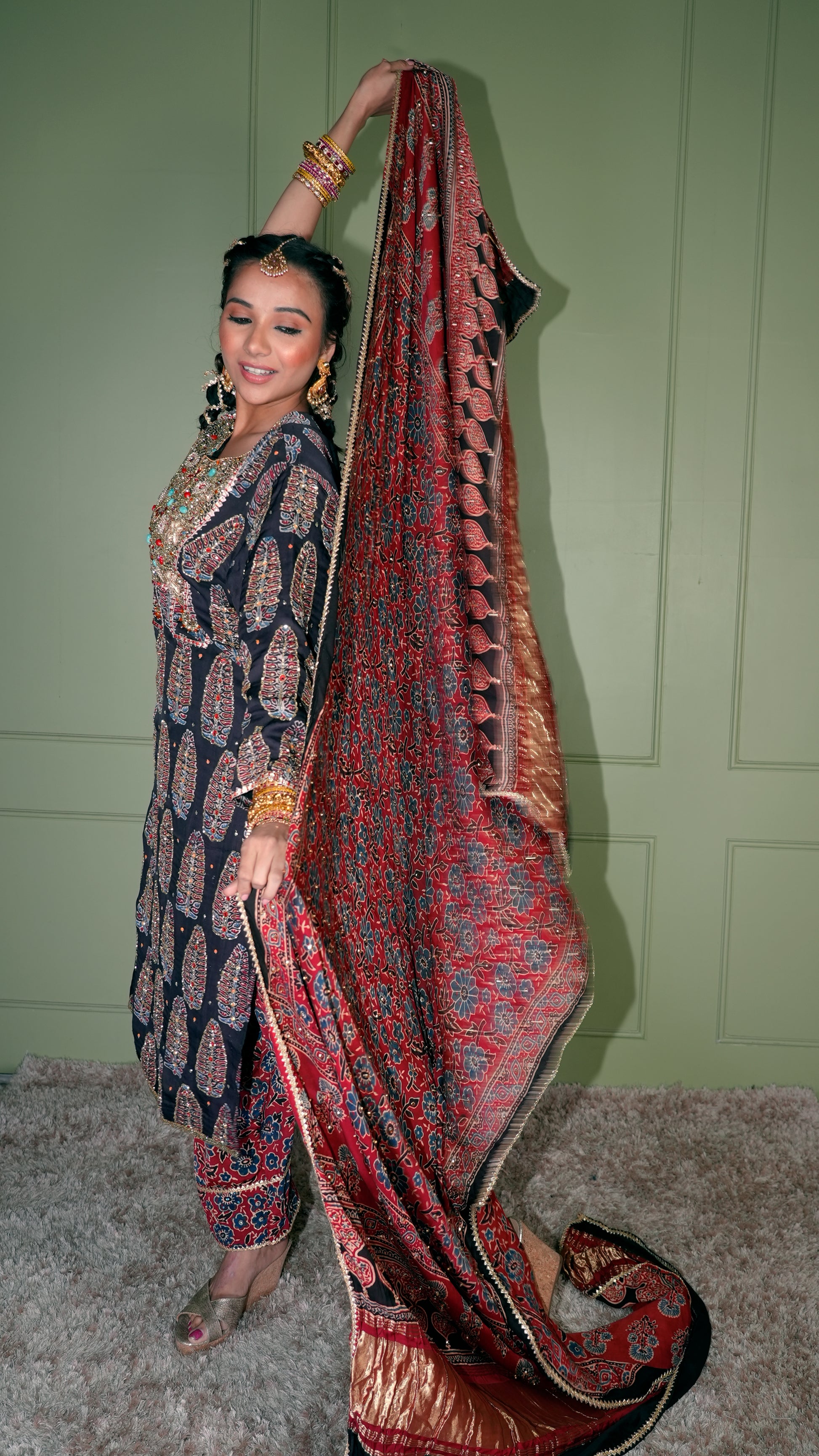 - The hand printed ajrakh is highlighted with detailed aari, resham, bead and mirror hand embroideries.