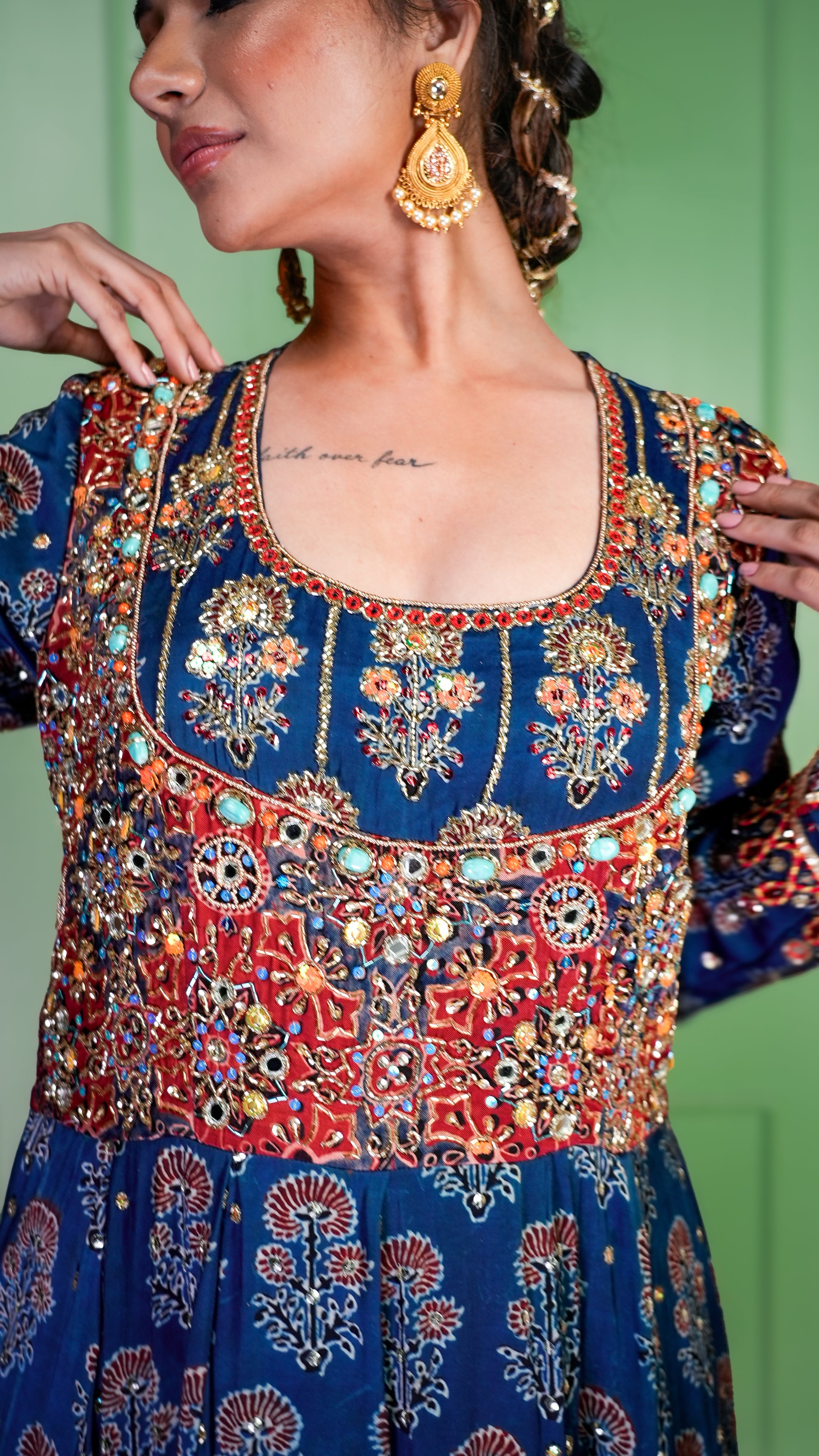 - The hand printed ajrakh is highlighted with detailed aari, resham, bead and mirror hand embroideries.