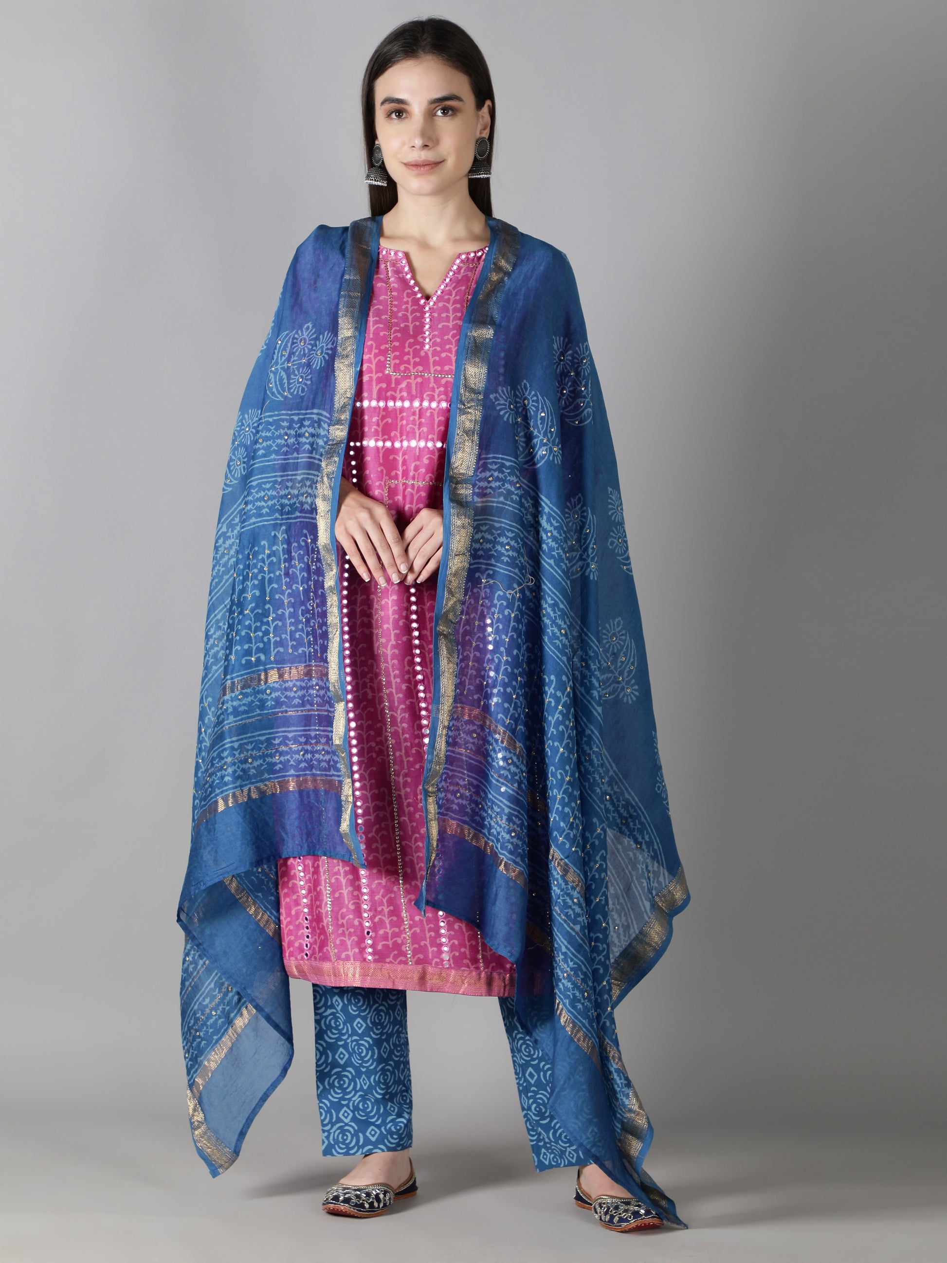 Carnation Pink Kurta With Sapphire Blue Pants And Dupatta