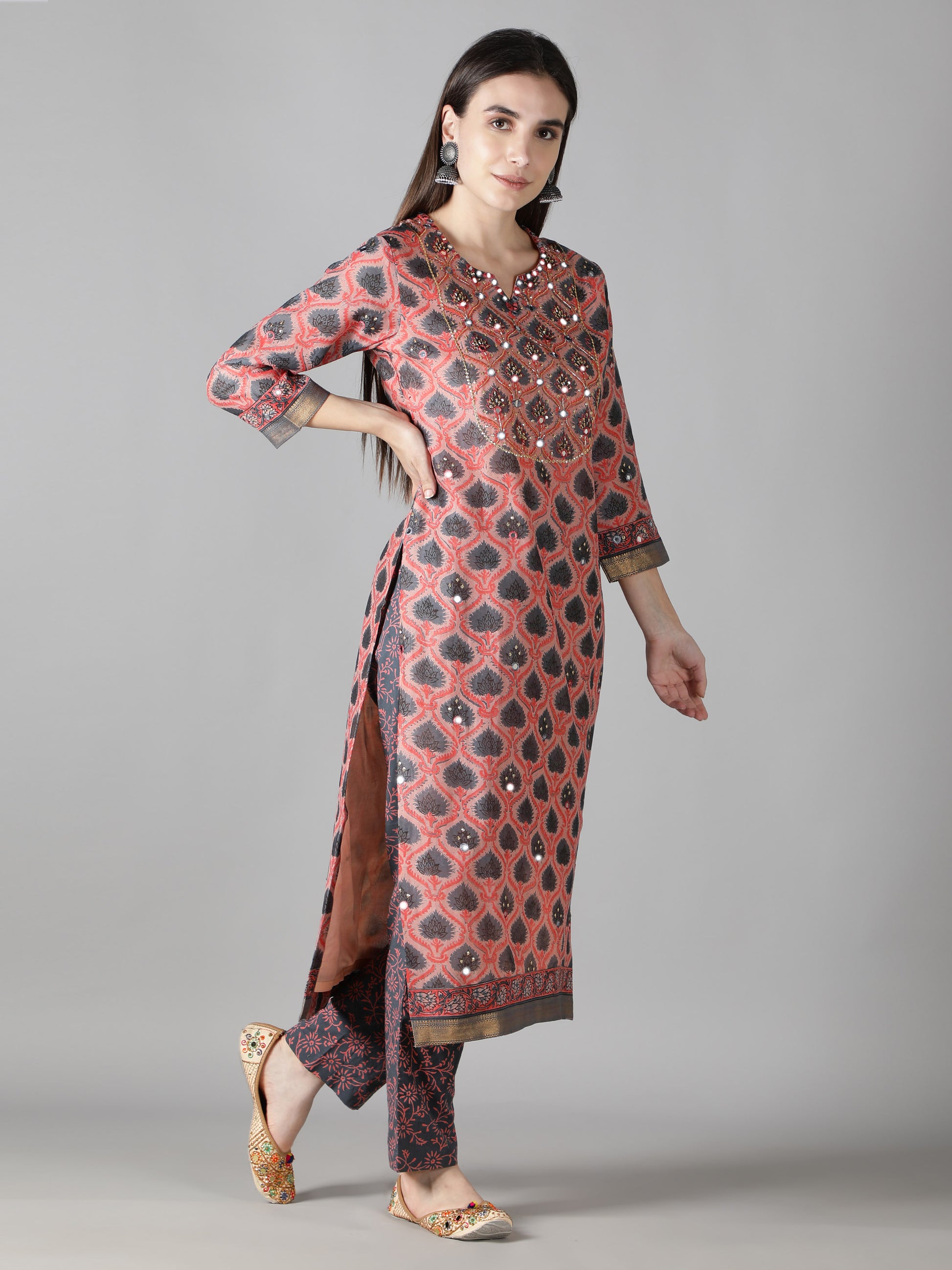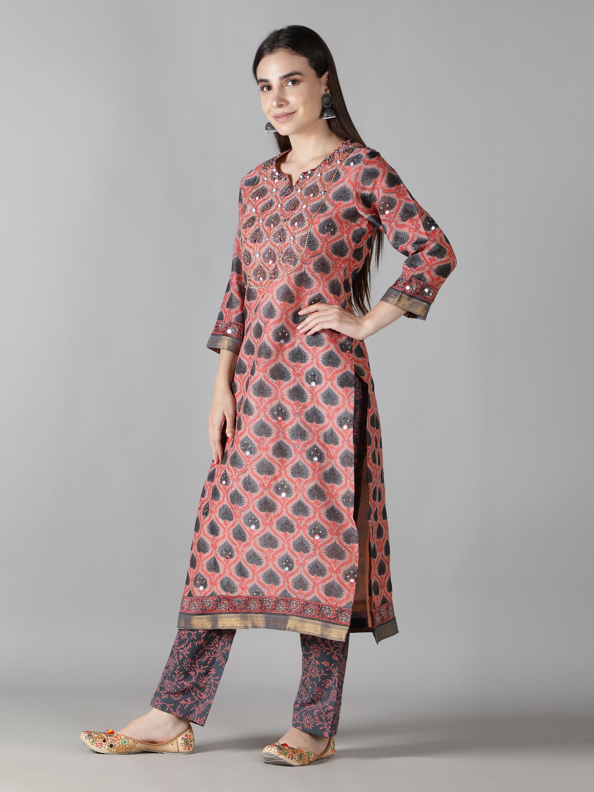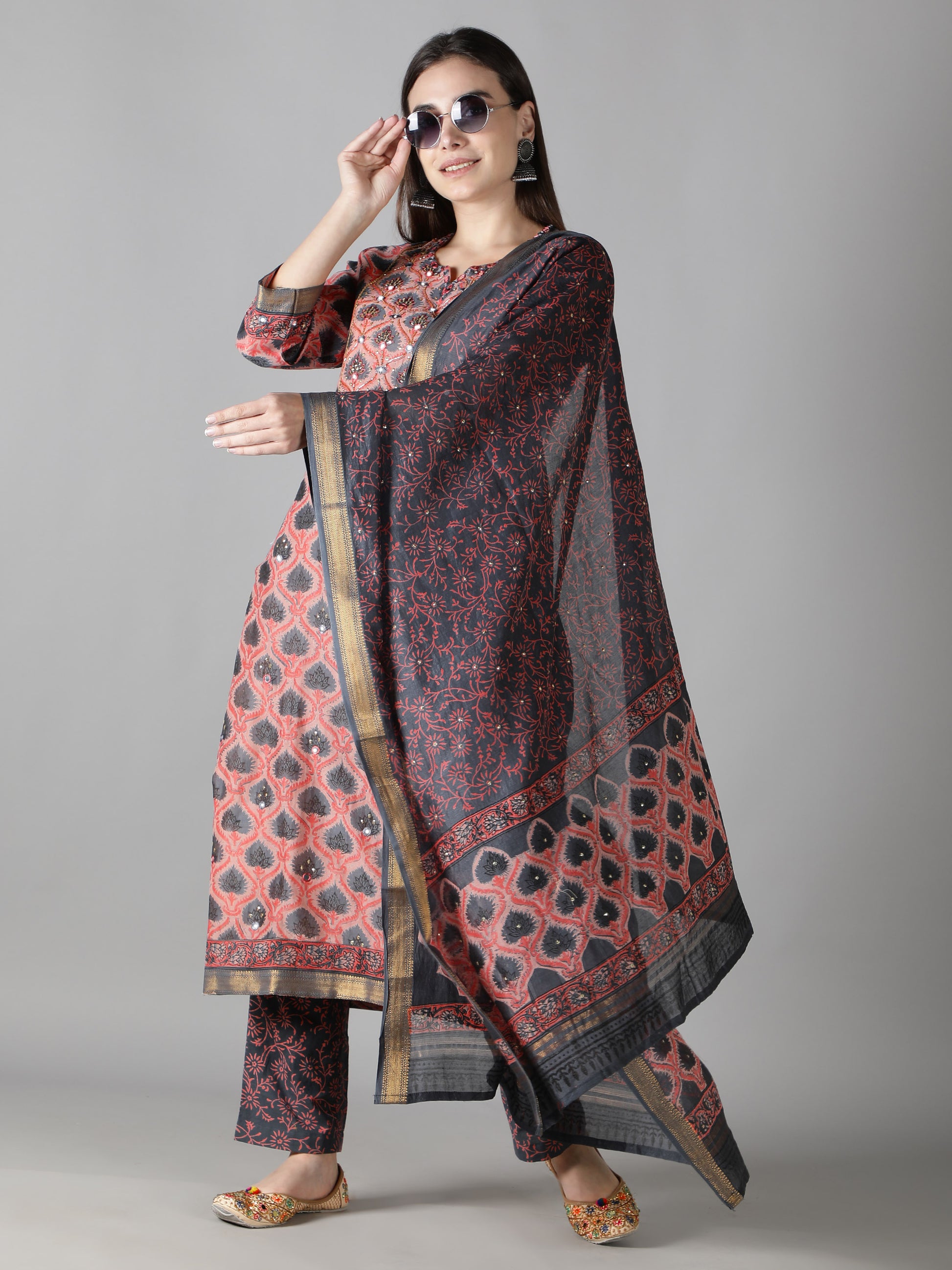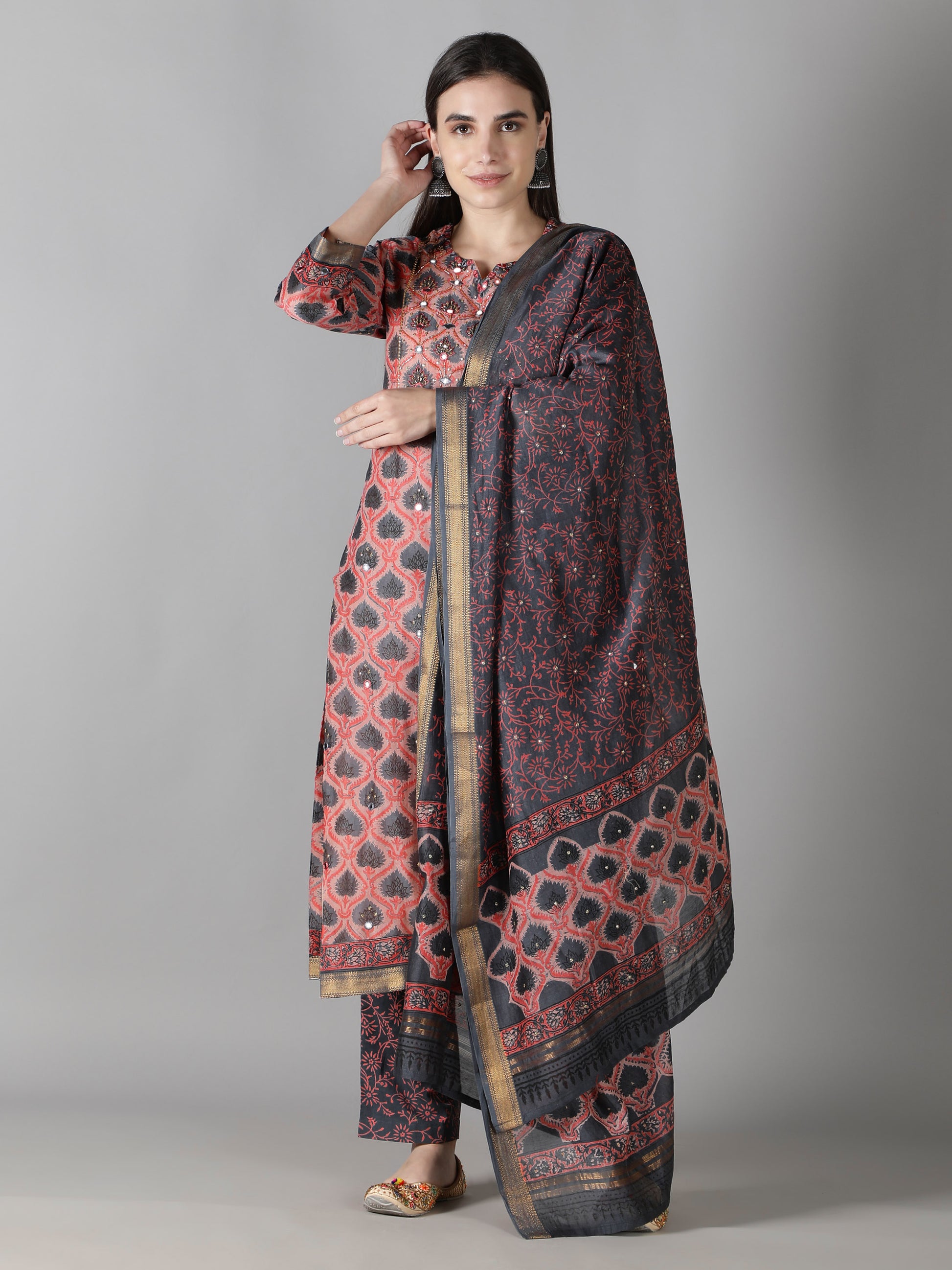 3. The stone grey dupatta with coral florals is hand embroidered and has zari borders.
