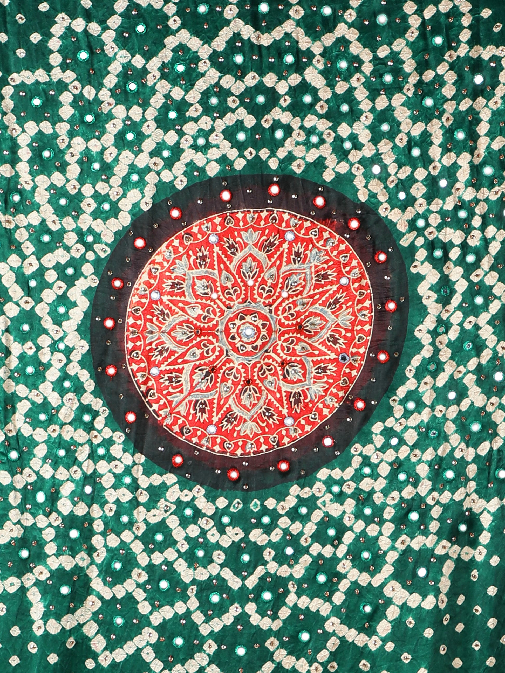 Be enchanting in this emerald green sheeshakari bandhej dupatta. The mandala motif in burnt orange adds grandeur.