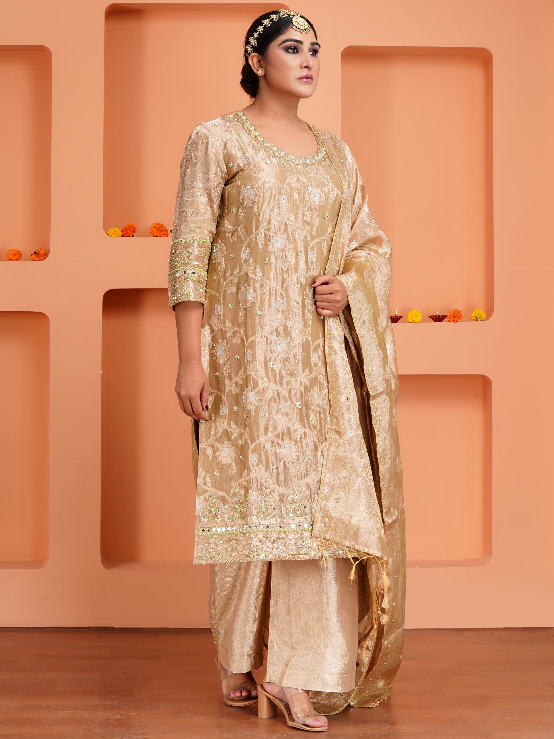 - The golden tissue silk dupatta is ornately hand embroidered.