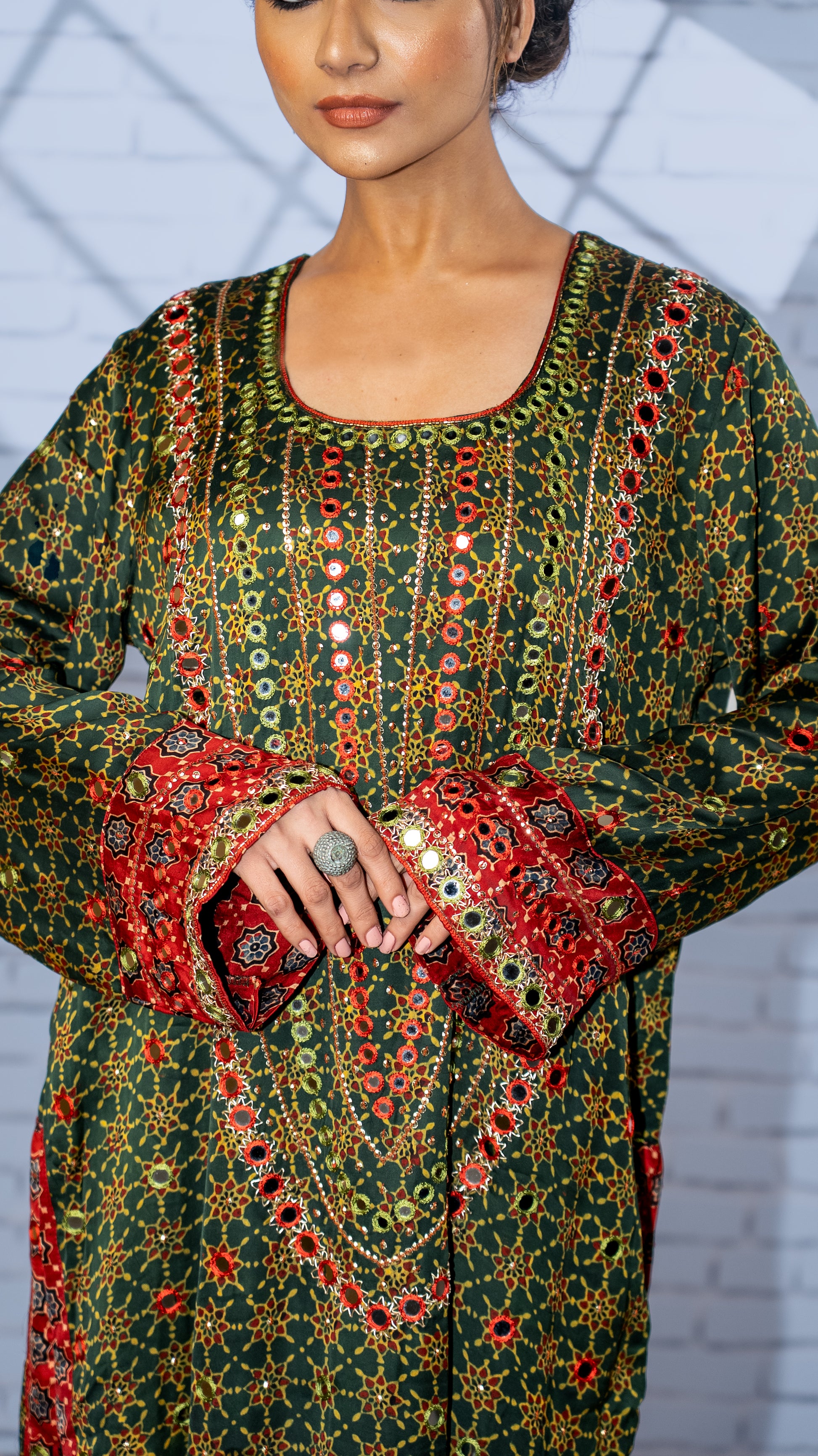 - The hand printed ajrakh silk is highlighted with aari, resham , beads and mirror hand embroideries.
