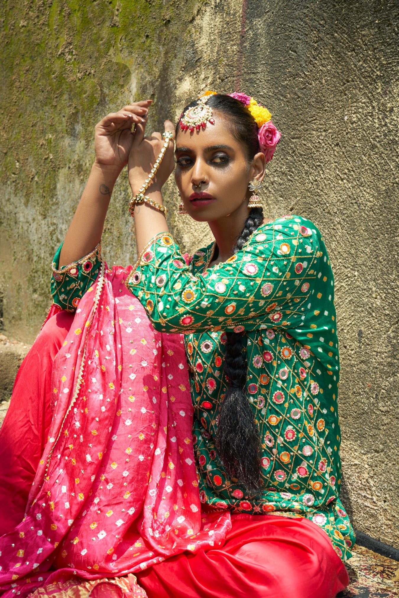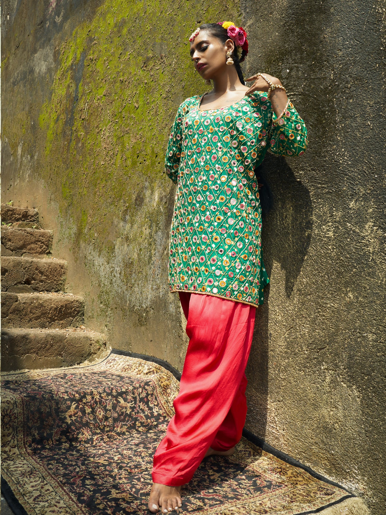 - This emerald green bandhani silk kurta features an ornate hand embroidered jaal.