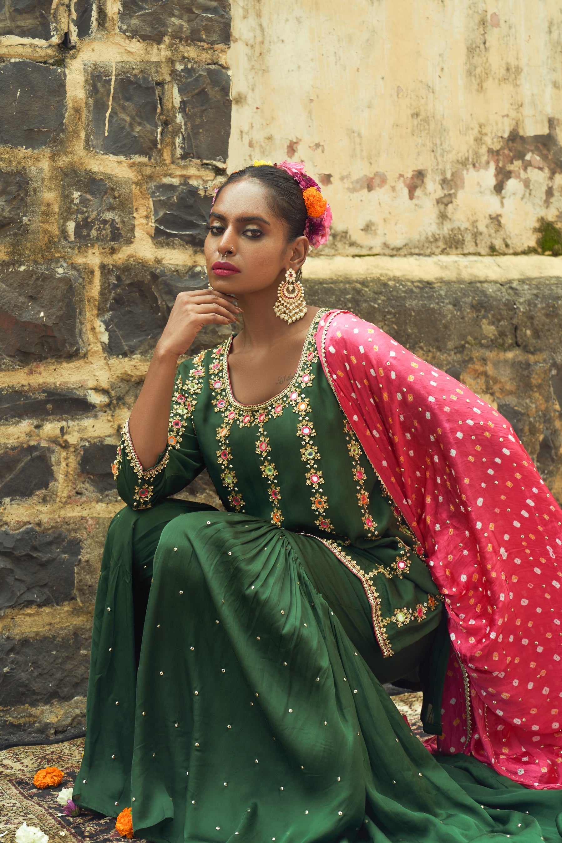 - Paired with a green hand embroidered silk sharara.