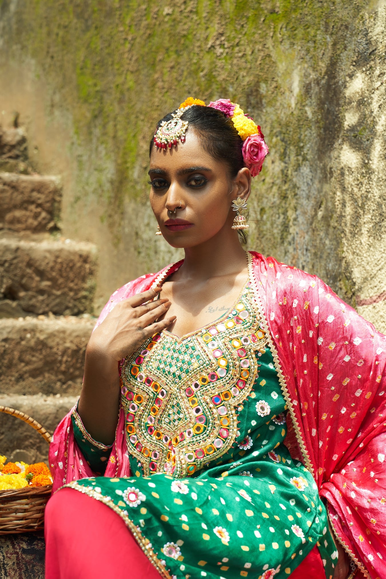- This emerald green bandhani silk kurta features an ornate hand embroidered yoke.