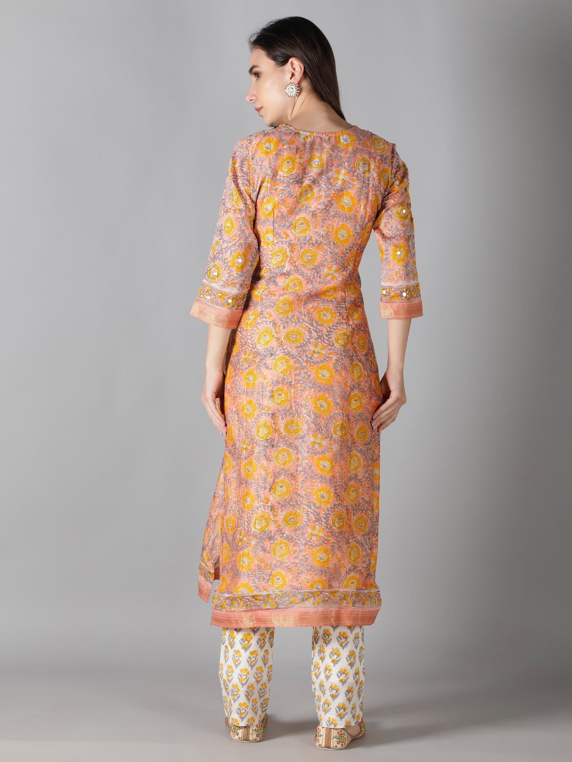 2. The sleeves and the hem line feature a peach, golden zari borders.