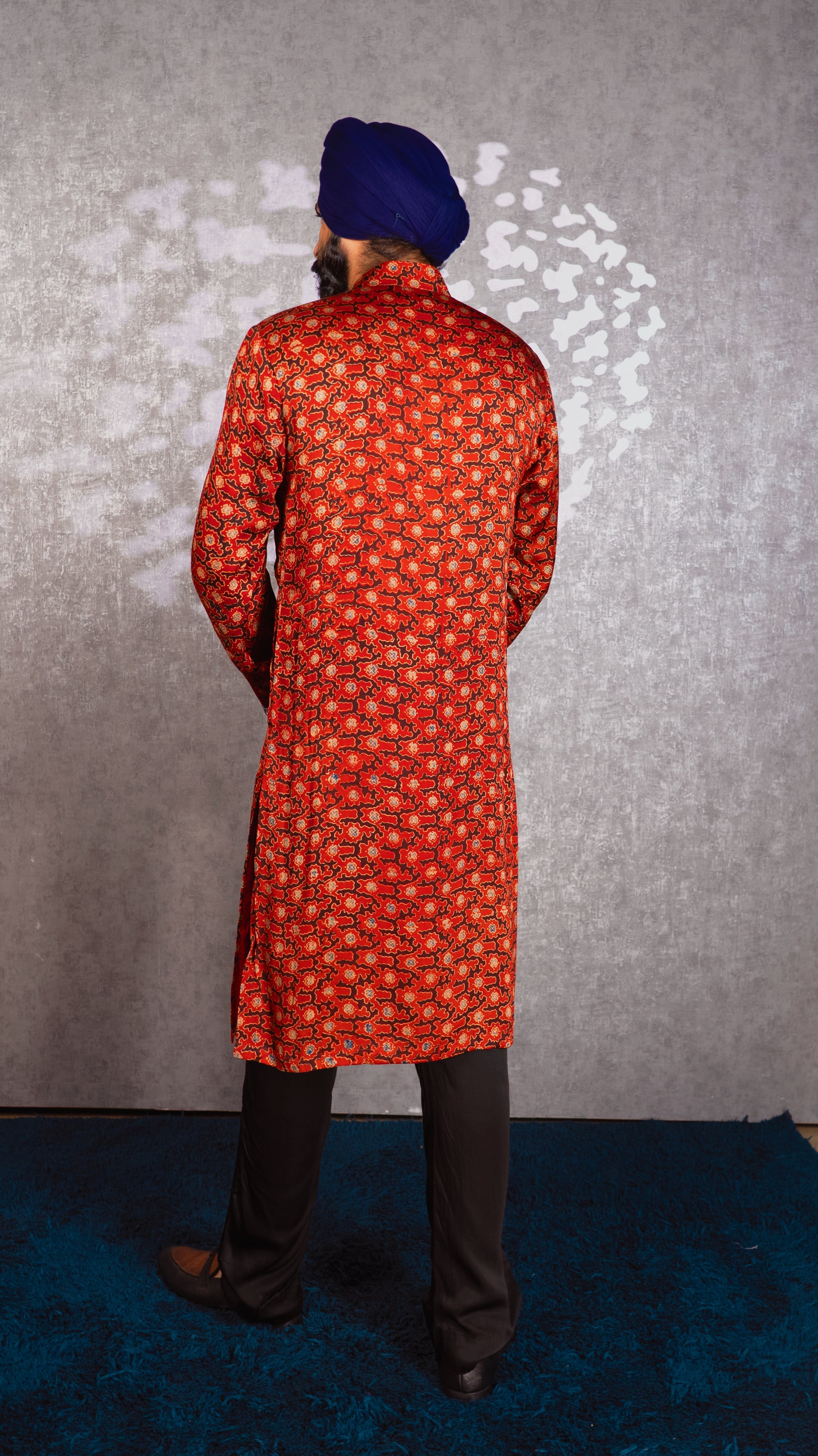 - This red silk kurta is hand printed with ajrakh