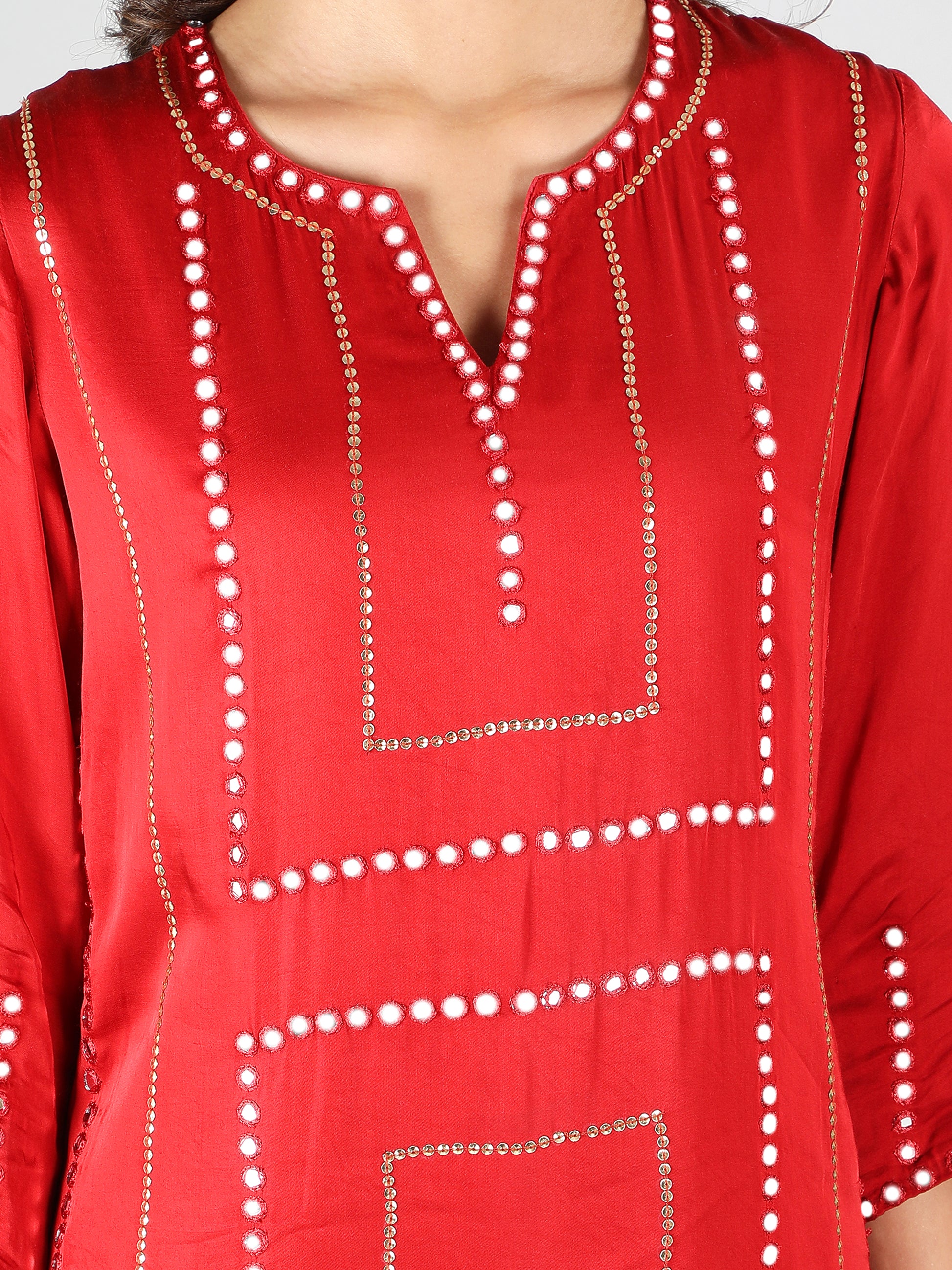 This crimson red kurta features hand embroidered vertical stripes all over the surface.