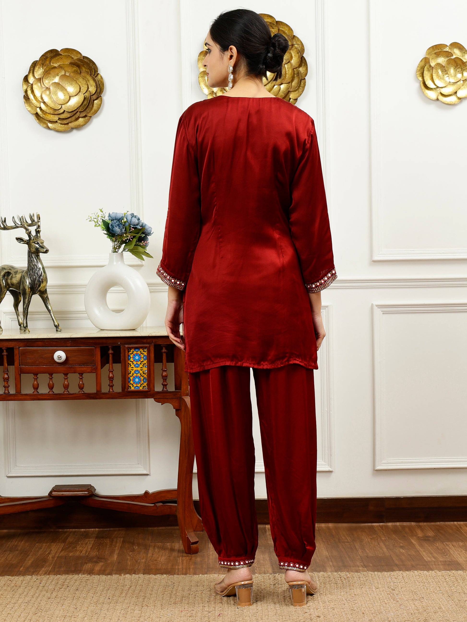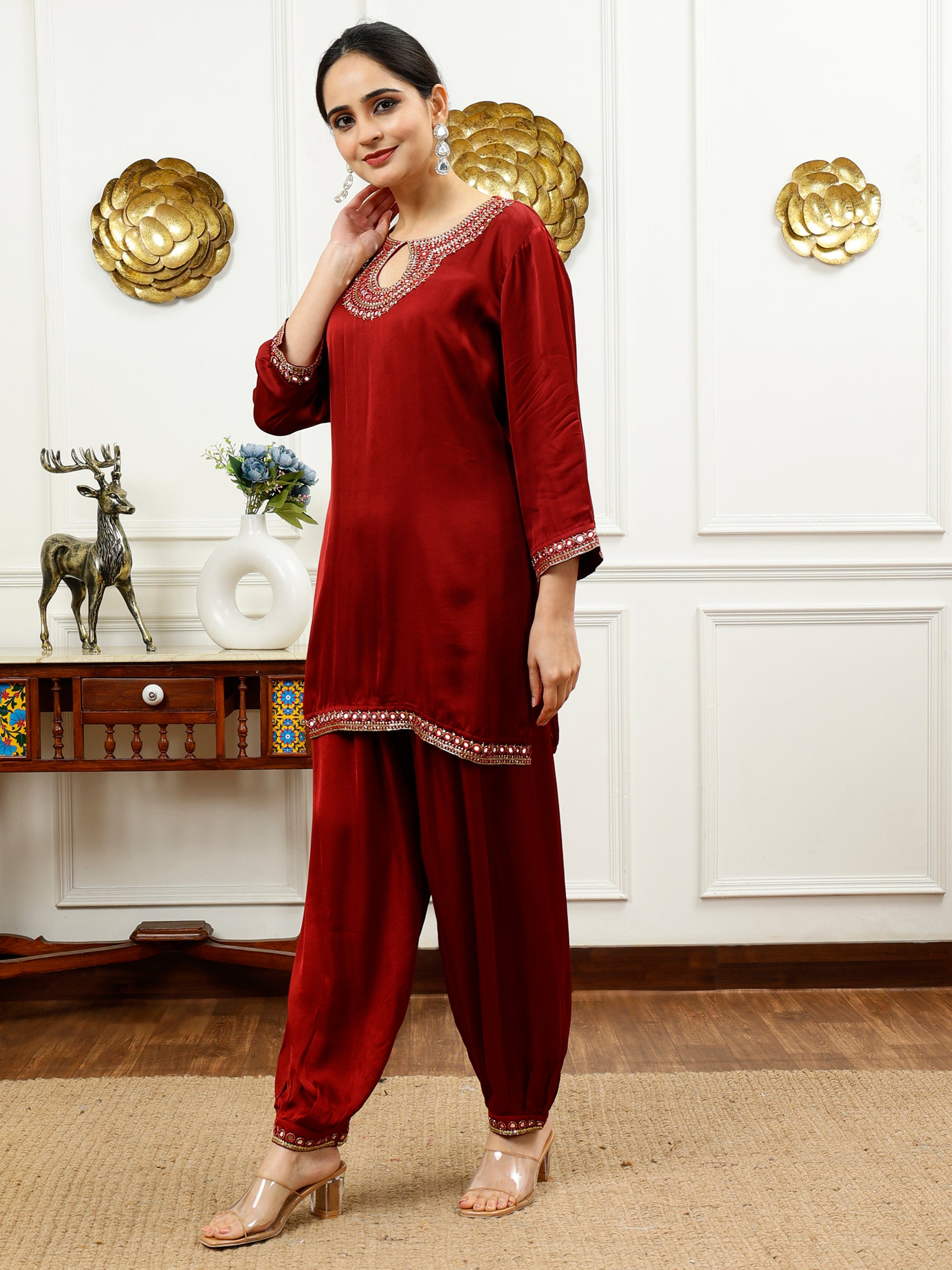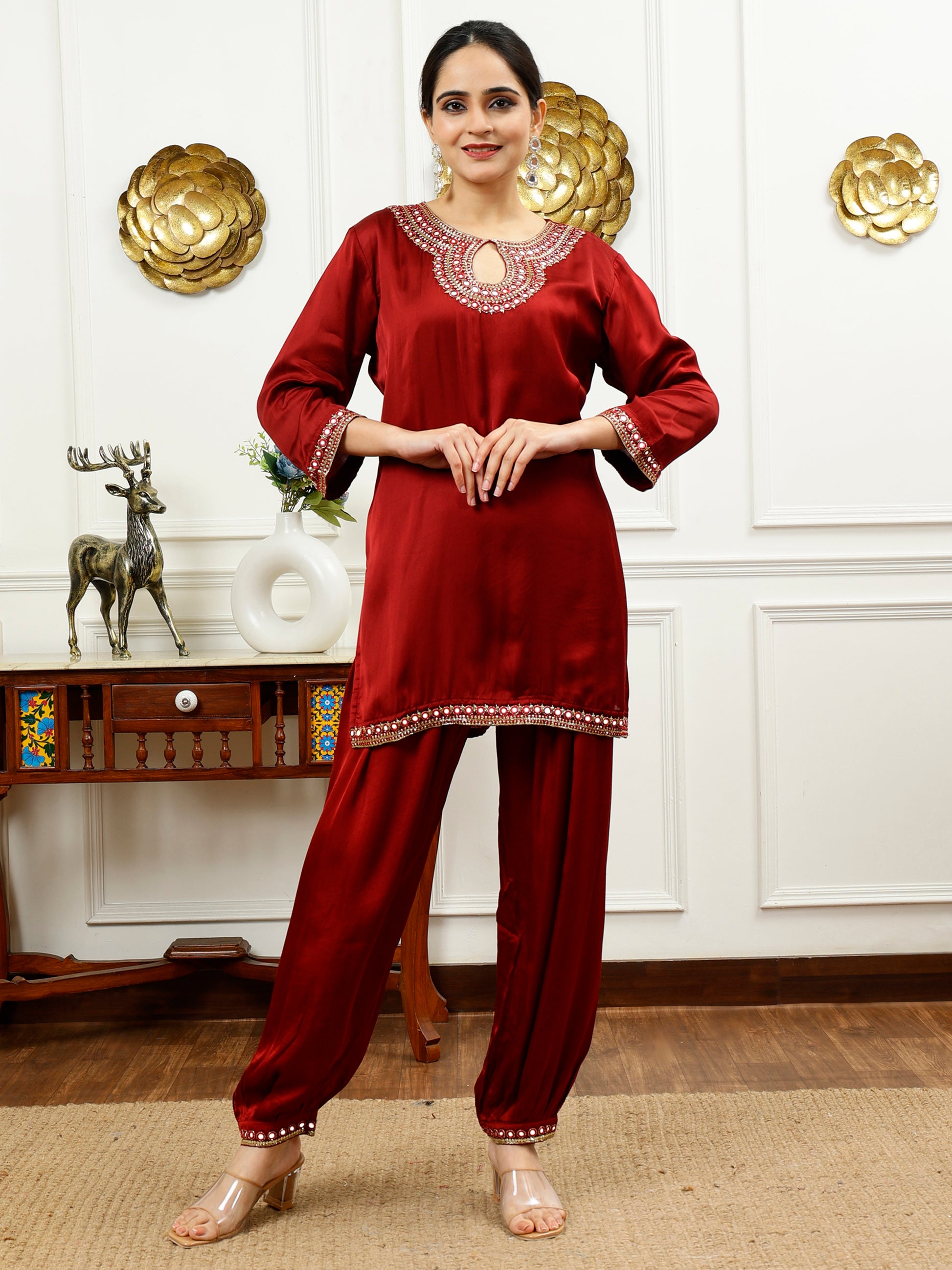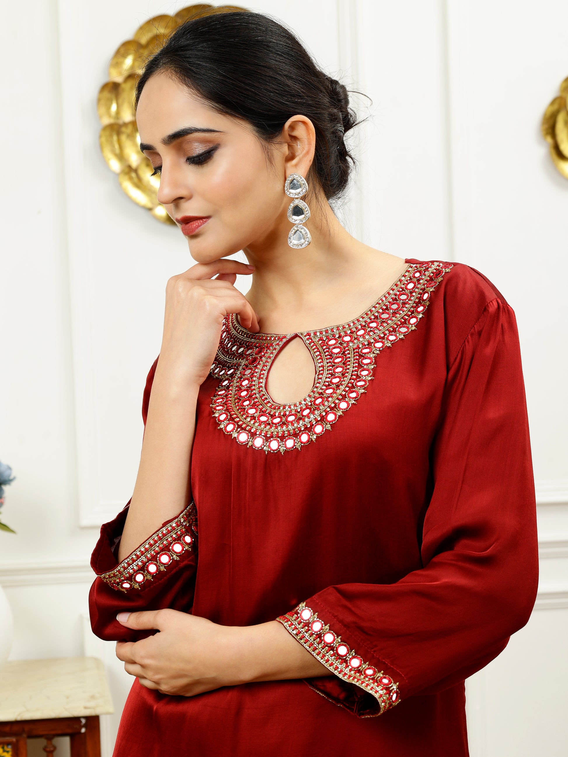 - The silk kurta features a scoop neckline embroidered with our signature sheeshakari, mirror hand work,french knots, beads, tila and kasab hand embroideries