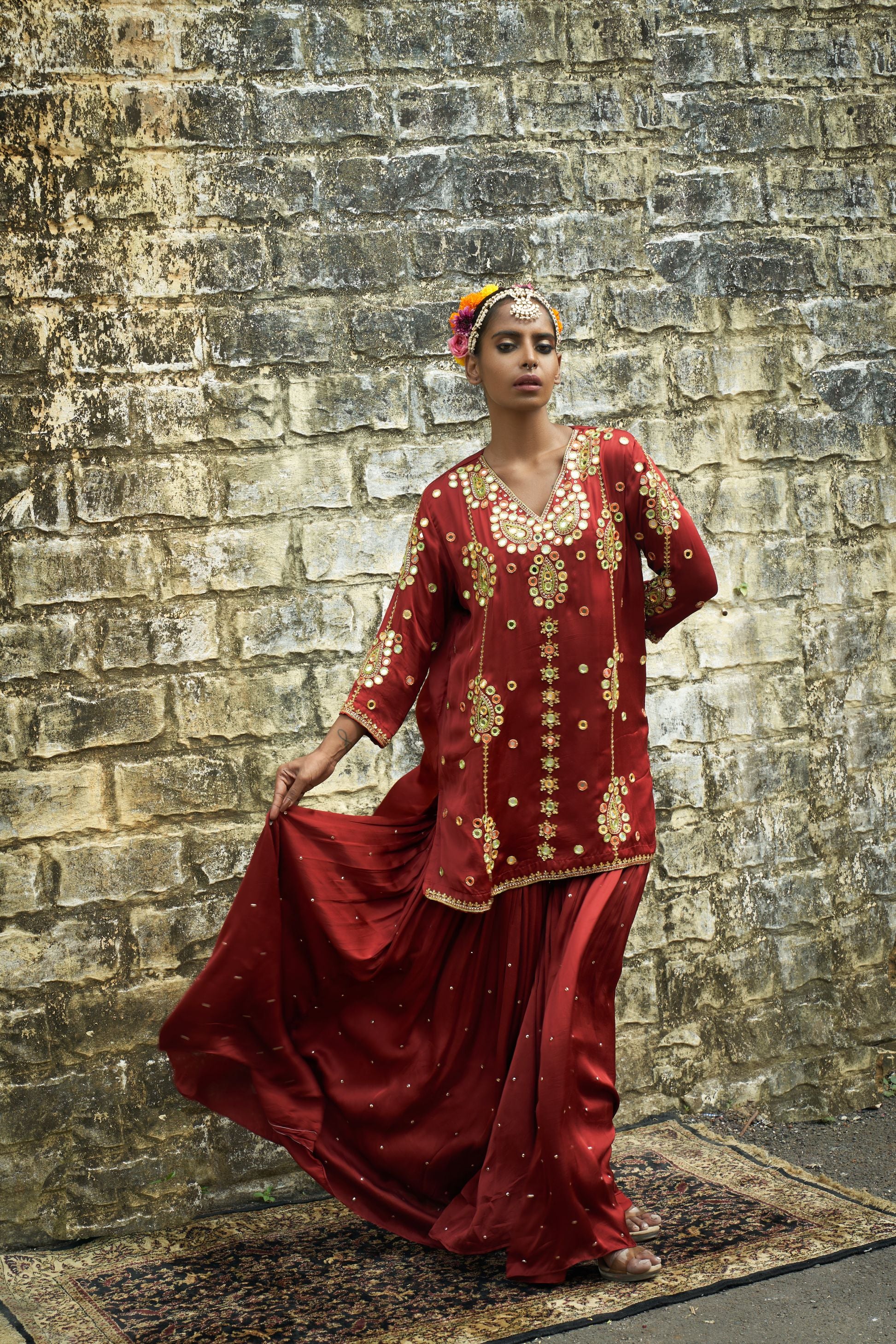 - This jewel toned rust coloured silk kurta features hand embroidered paisley motifs.