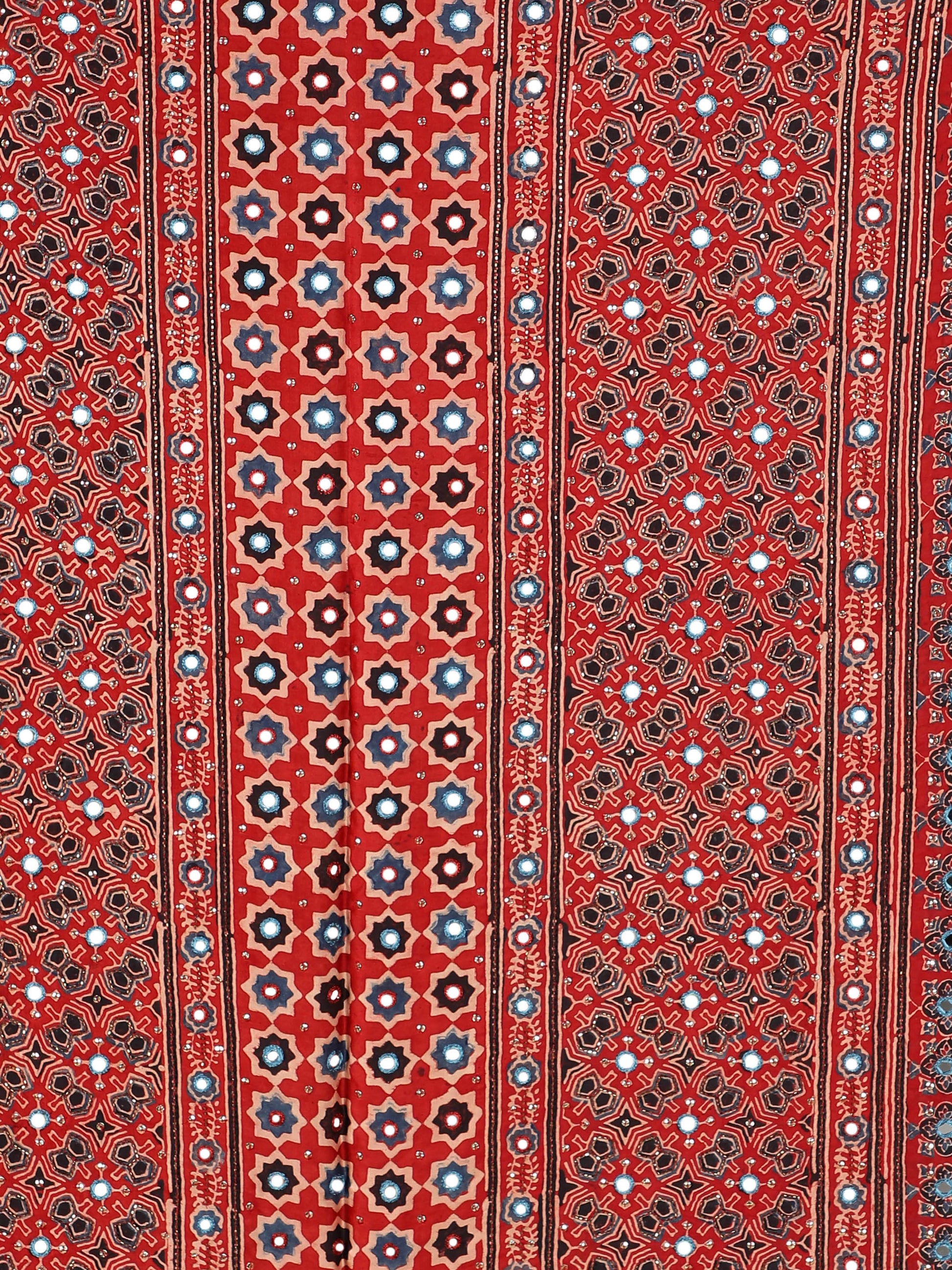 - The star motifs on the red silk mirror the sky filled with twinkling stars.