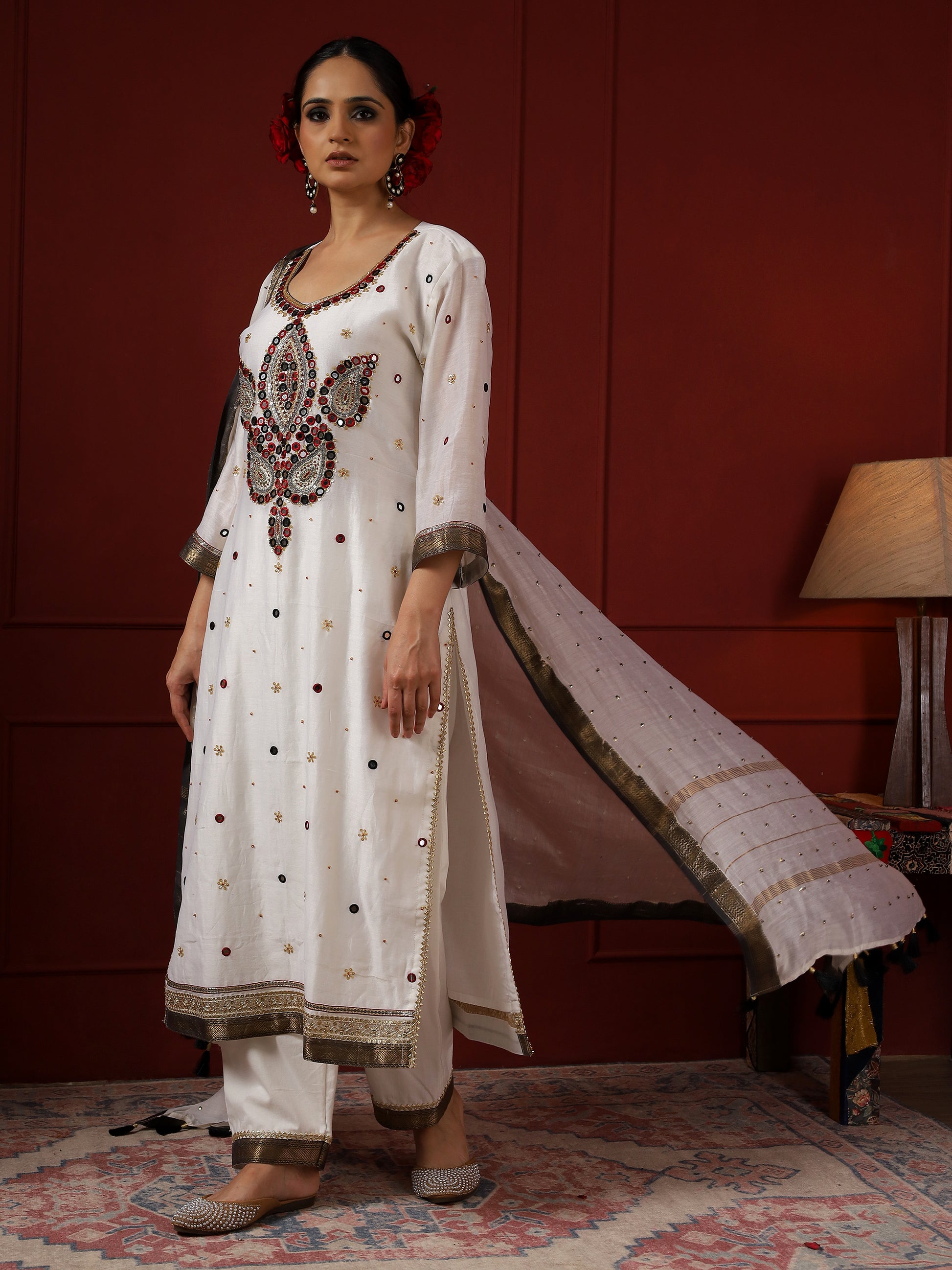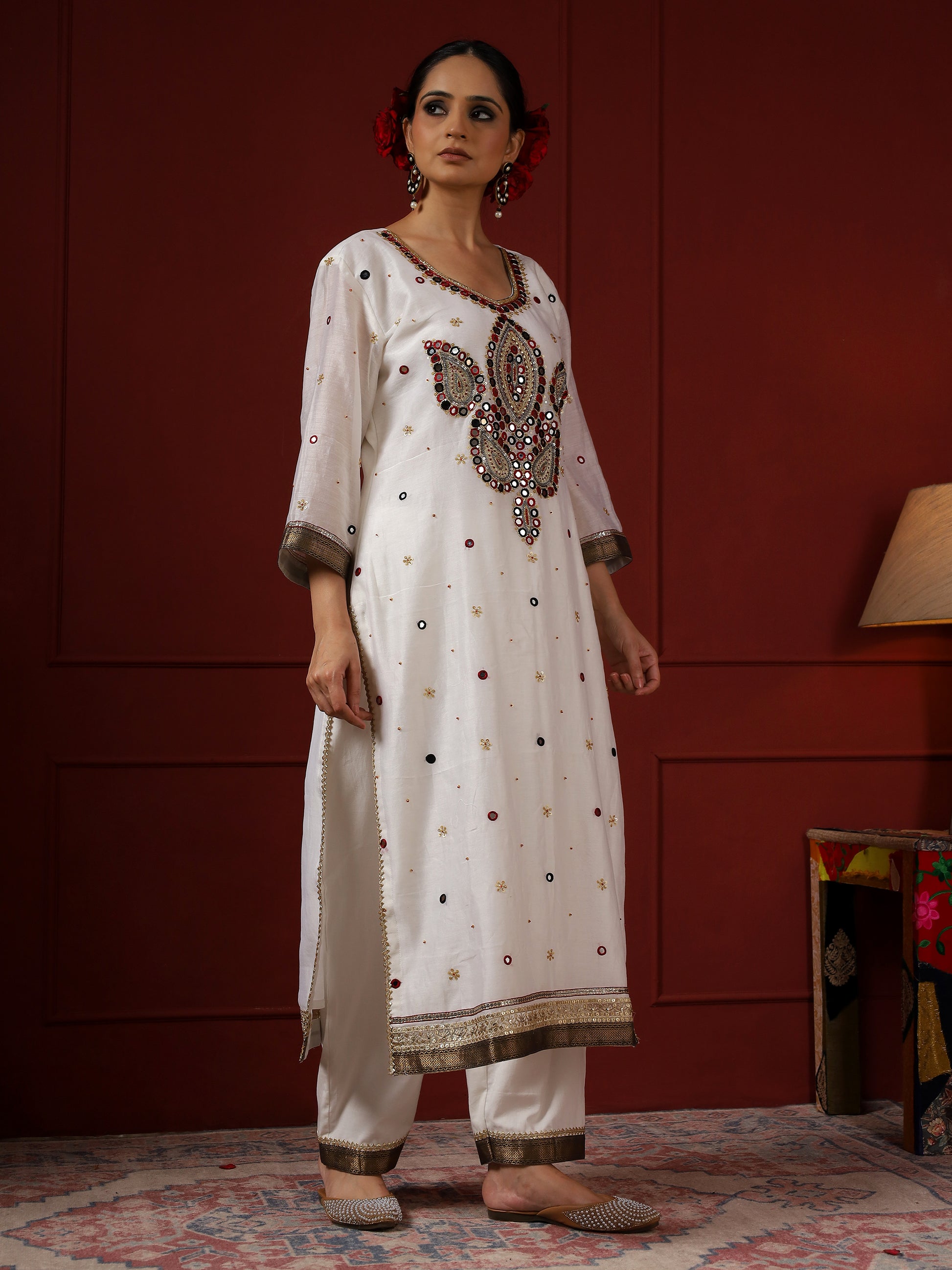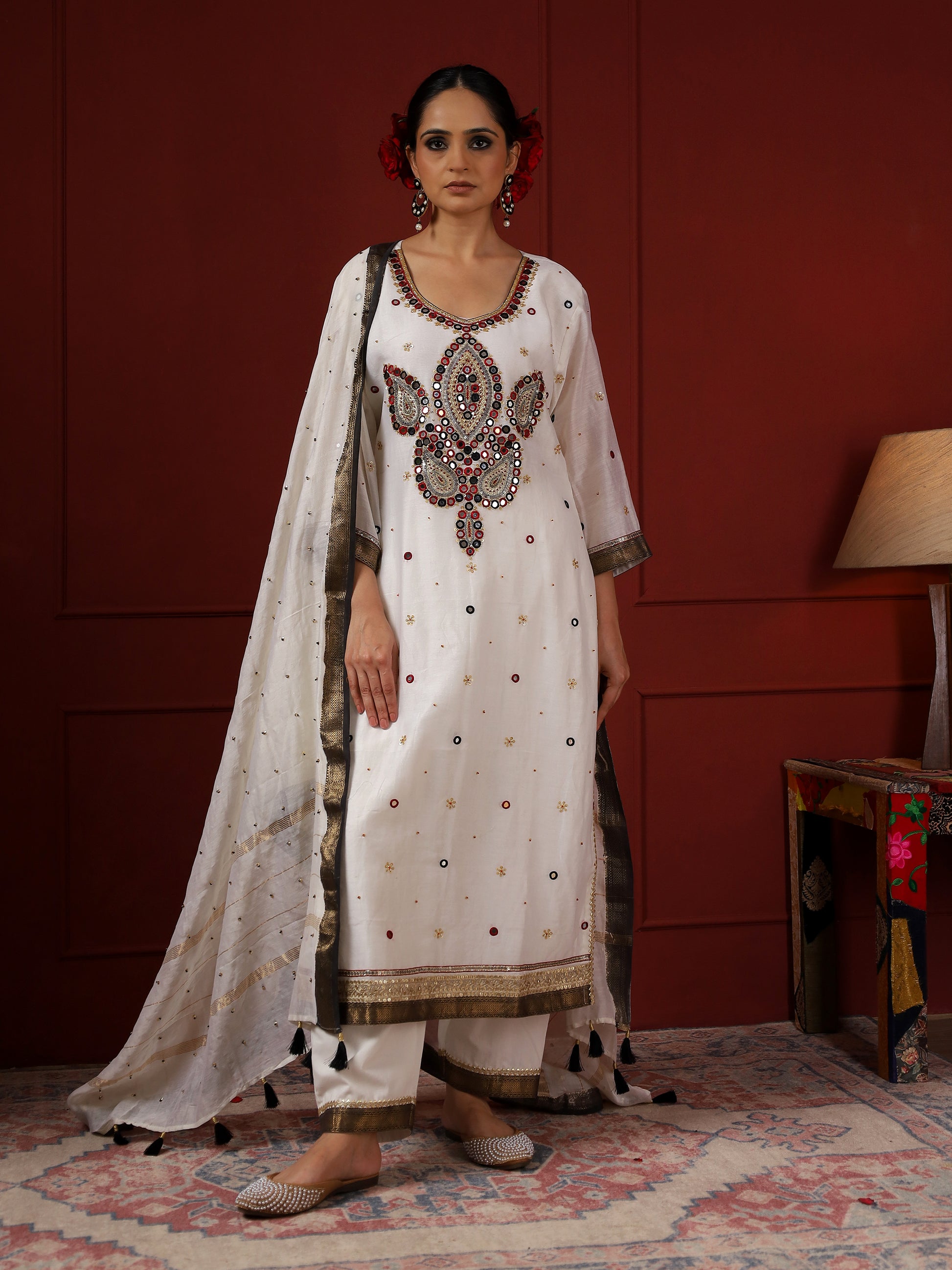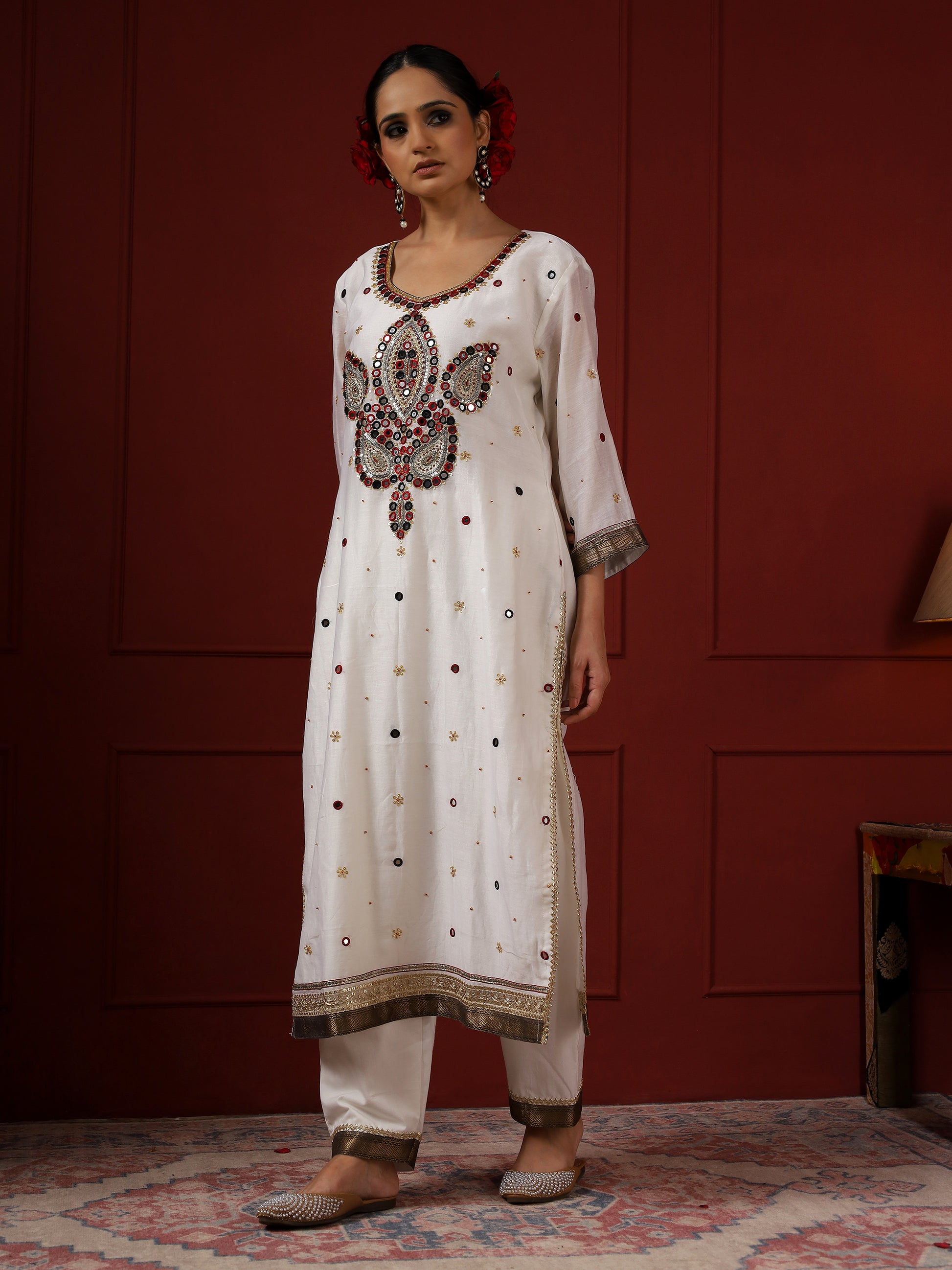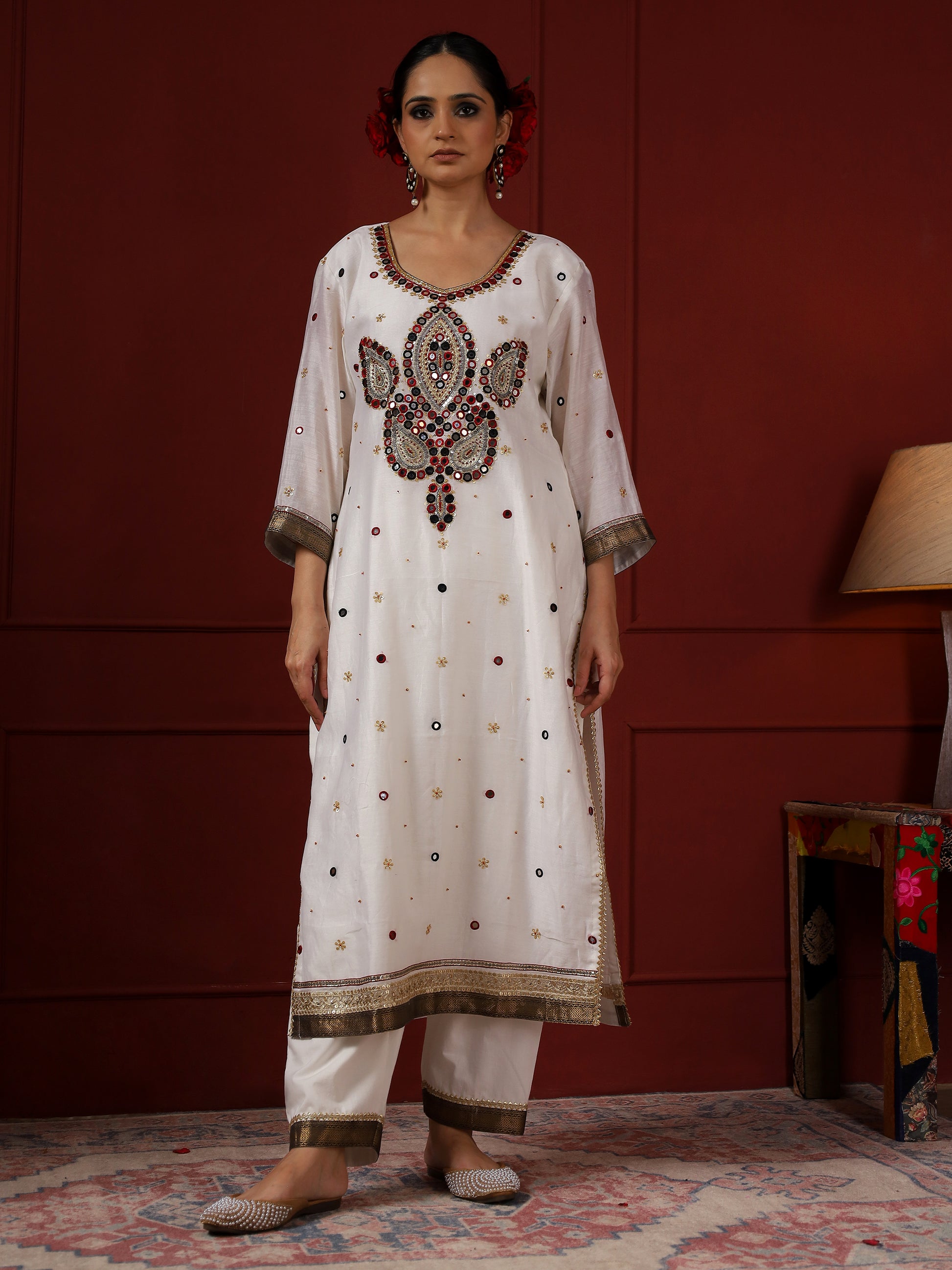 - This pristine white silk kurta feature hand embroidered paisley motifs The mirror work.resham and bead handwork give it an alluring look the dupatta is ornately hand embroidered and has zari borders The white pants feature a zari border at the cuff and have a straight fit