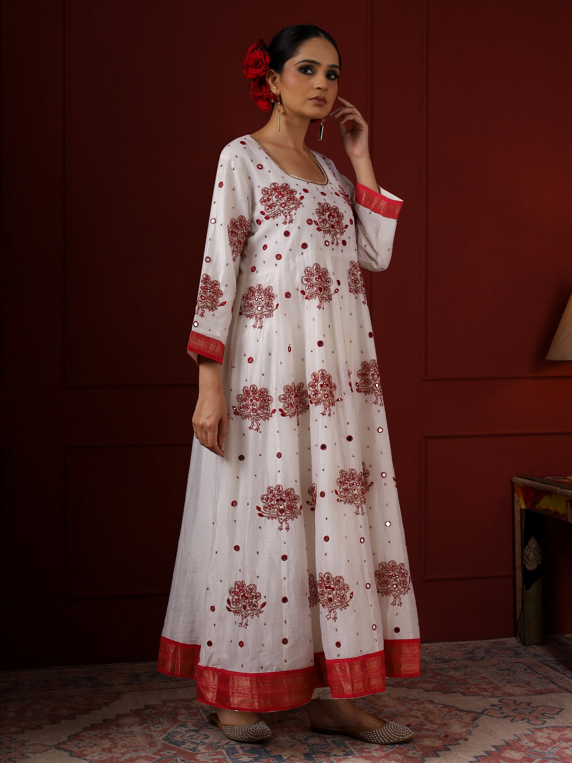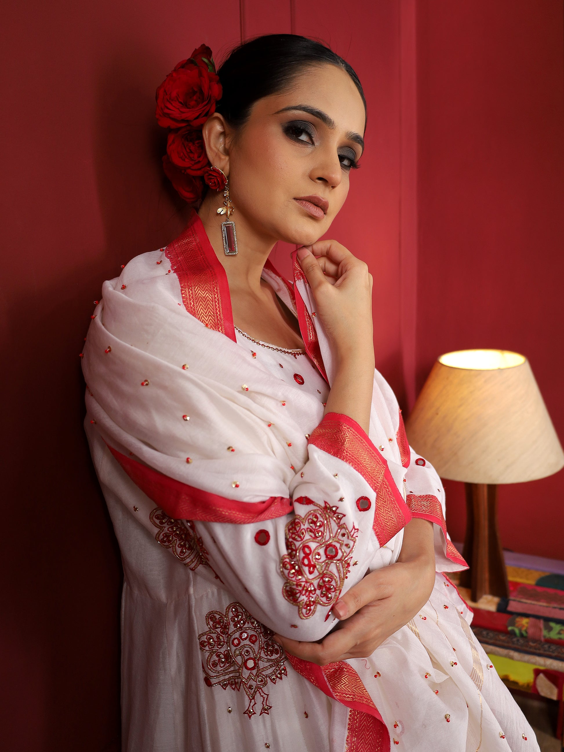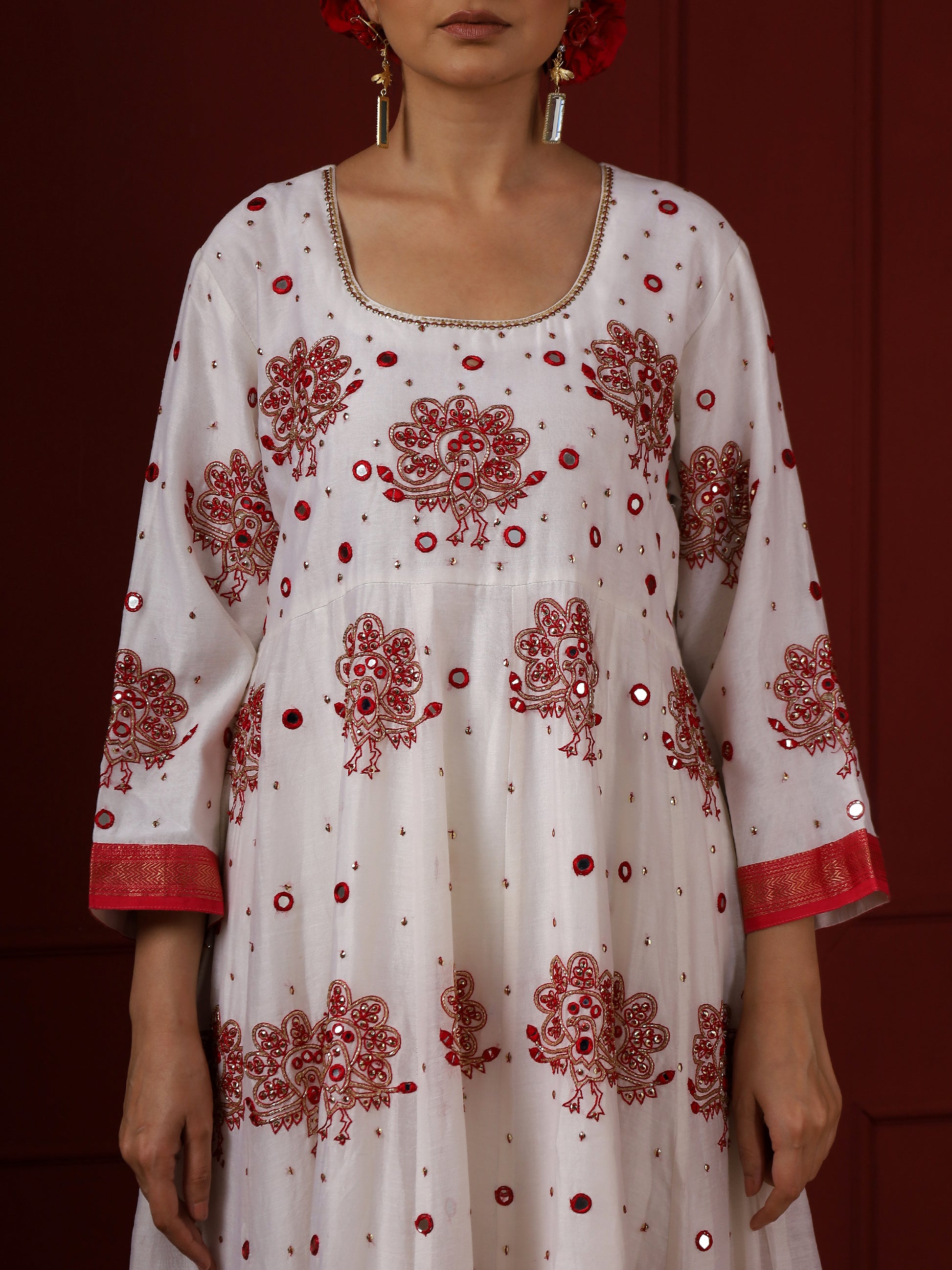 - This pearl white silk anarkali feature dancing peacock motifs all over the surface. The mirror work.resham and bead handwork give it an alluring look The dupatta is ornately hand embroidered and has zari borders The white pants feature a zari border at the cuff and have a straight fit.