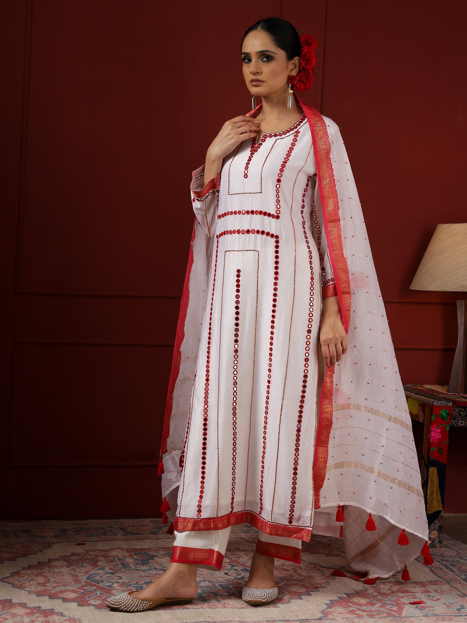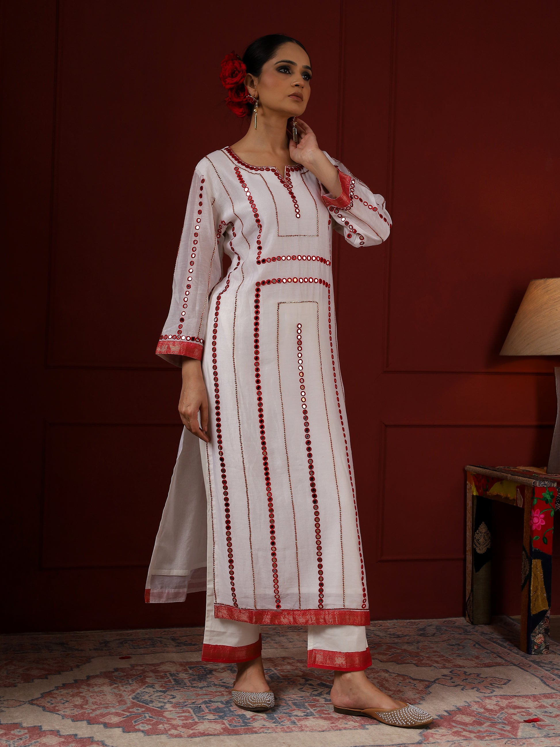 - this pearl white silk kurta features a umique interplay of embroidered vertical stripes the mirror work,resham and bead hand work give it a magnificent look the dupatta is ornately hand embroidered and has zari borders the white pants have a straight fit and feature a zari border at the cuff.